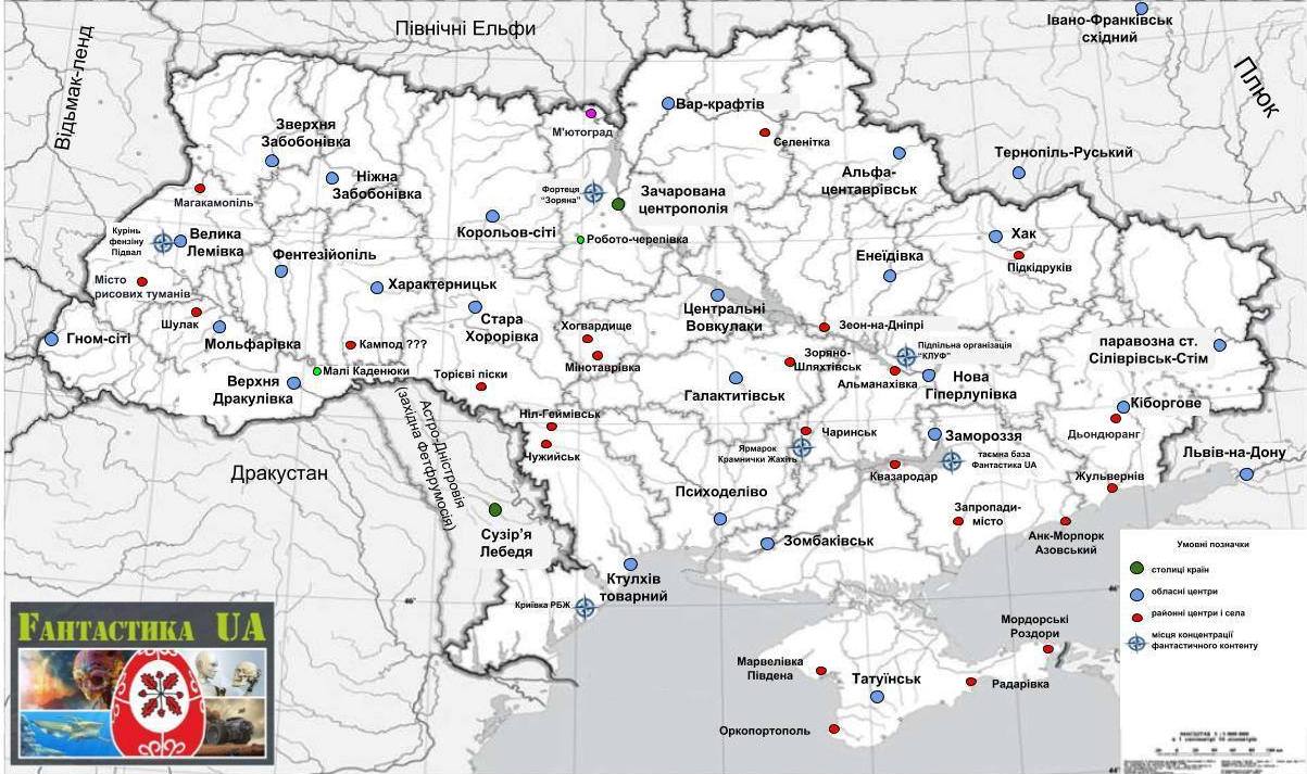 І наостанок. Днями буквально всі сайти України тиражували «Фантастичну карту», яку опублікував мешканець Запоріжжя Роман Онищенко (називає себе Роман Мтт) - засновник популярної спільноти «Фантастика UA» і автор книги «Зомбі-Україна». У мене все чудово і з гумором, і з фантазією, та хай пробачить мені пан Мтт – ніяк не втямлю, з якого дива Черкаси в нього на карті позначені як «Центральні Вовкулаки», а Монастирище – як «Хогвардище»?