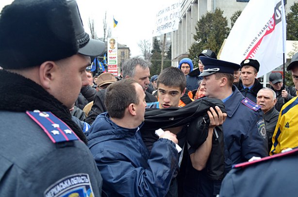 На Театральній площі Черкас з'явилася група молодиків у футболках з написами "ВО "Свобода" на спині та гаслами "Бий жидів!" на грудях. Організатори мітингу негайно звернулися до присутніх на заході правоохоронців із вимогою затримати молодиків та вжити всіх необхідних заходів. Проте це завдання для міліції, очевидно, виявилося надто складним.