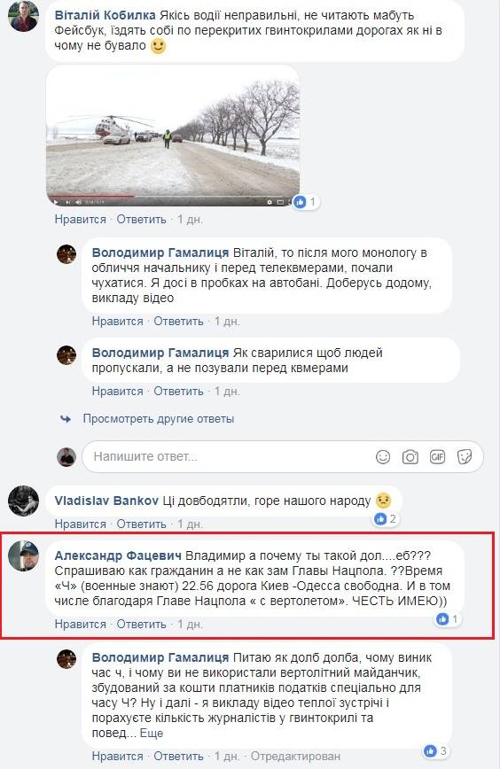 Щодо описаної у пості ситуації про блокування самим гвинокрилом керівника Нацполіції траси. Беззаперечним позитивом є особисте втручання Керівника Нацполіції у резонансну подію з блокування сотень вантажівок на трасі Київ – Одеса. Власне, дякуючи запису все з того ж гвинтокрила, суспільство було об’єктивно поінформовано і про масштабність події,і , що головне, про належність реагування Нацполіції ( разом з іншими державними Органами та Службами) на подолання форс-мажорних обставин. Під час здійснення своїх повноважень правоохоронці мають право на здійснення певних дій, які тимчасово обмежують право громадян. Чи була виправдана посадка гвинтокрила на саму трасу? Не знаю. Власне, щоб «поставити і таке незручне питання» з метою отримання адекватної відповіді , як я вбачаю, і було розміщено такий допис автора.