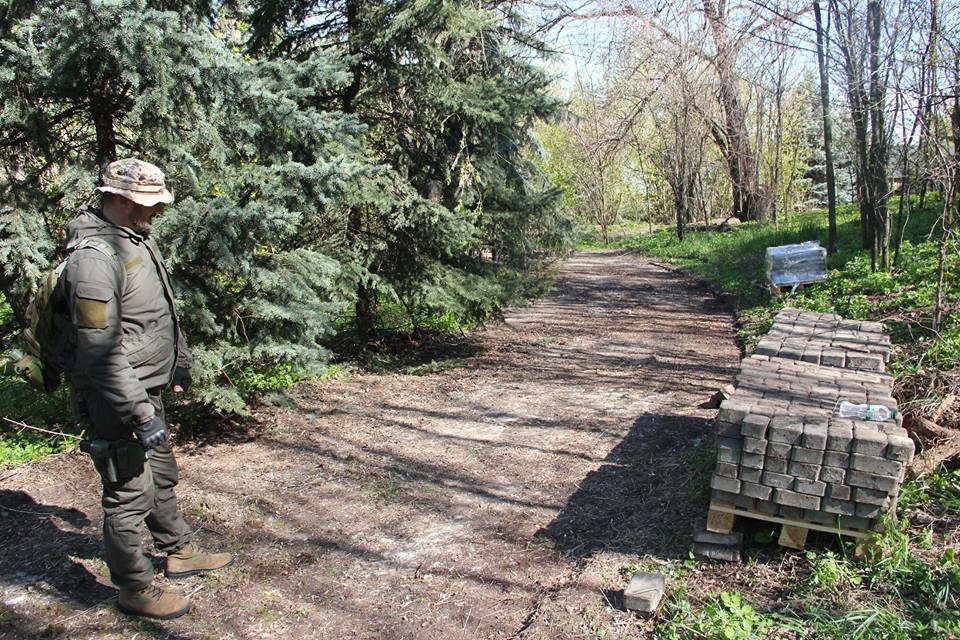 Оглянувши місцевість знизу, члени робочої групи направились до території піонертабору. Крокуючи по бетонній дорозі, яка розділяє територію колишнього піонерського табору «Салют», працівники заповідника та природоохоронці здійснювали фотозйомку. На даній території знаходяться два сучасні дерев’яні будинки, фасади яких виходять на дорогу. До першого підійти не вдалось, так як перед ним була прив’язана велика собака, тому всі направились до іншого будинку. Біля подвір’я будинку було виявлено 5 великих рулонів металевої сітки, риболовецькі сіті (фото додається).