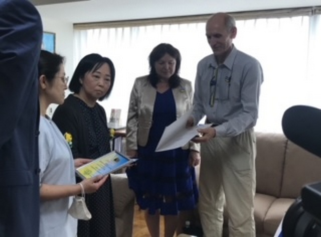На церемонії вручення відзнаки НСЖУ японській корпорації GREEN COOP за її внесок у підтримку українських журналістів у час війни (Токіо, 2022). Фото з архіву ВБФ «Журналістська ініціатива»