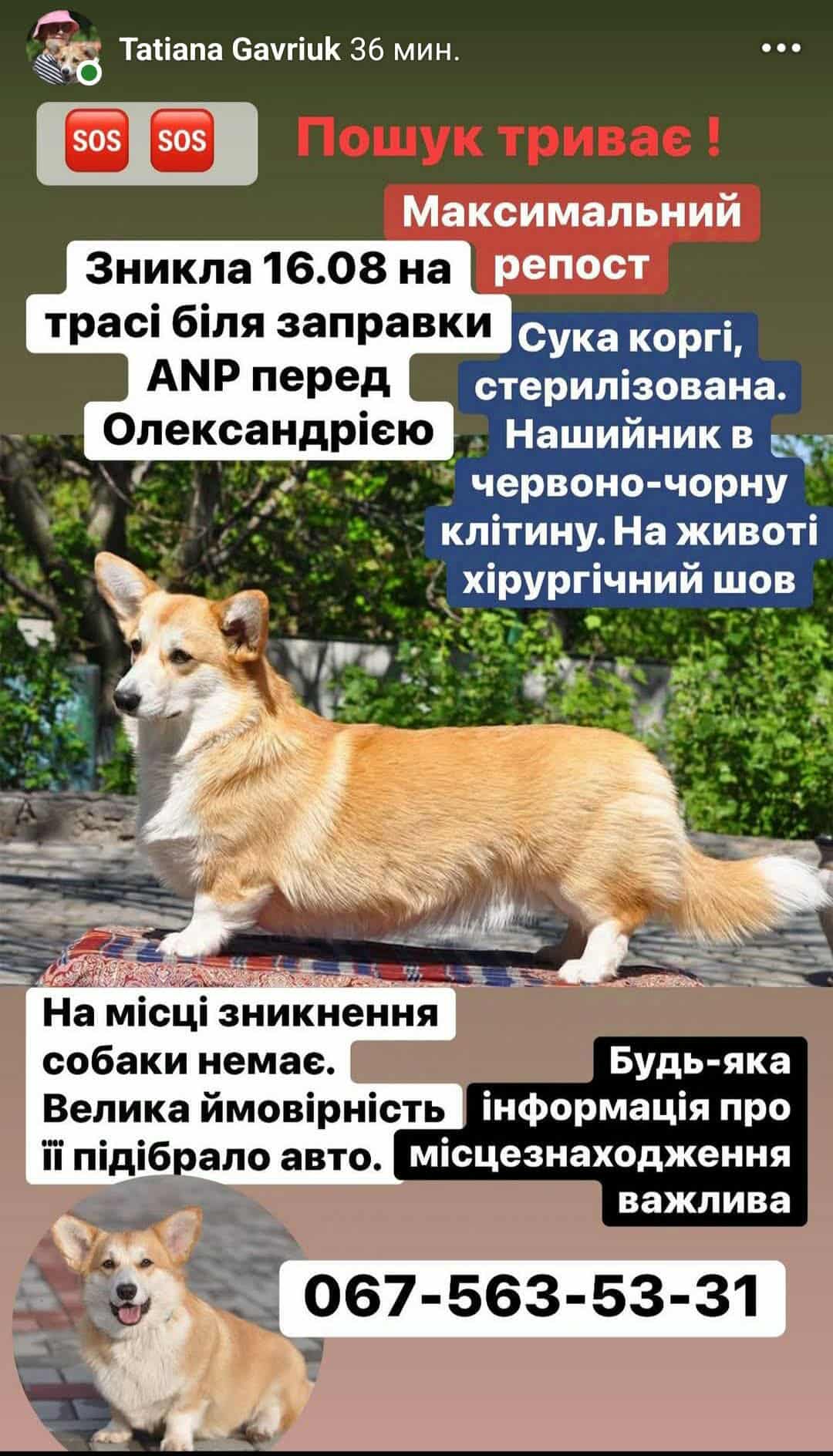 «Придивіться уважно, якщо побачите схожу на коргі собаку, яку не зустрічали раніше, або у вас по сусідству зʼявилась доросла коргі, не гайте часу, телефонуйте мені, - пише на своїй сторінці в соцмережі власниця Тетяна. - Будь-яка інформація дуже важлива. Вірю в доброту людей, і в нашої історії обовʼязково буде хепі енд».