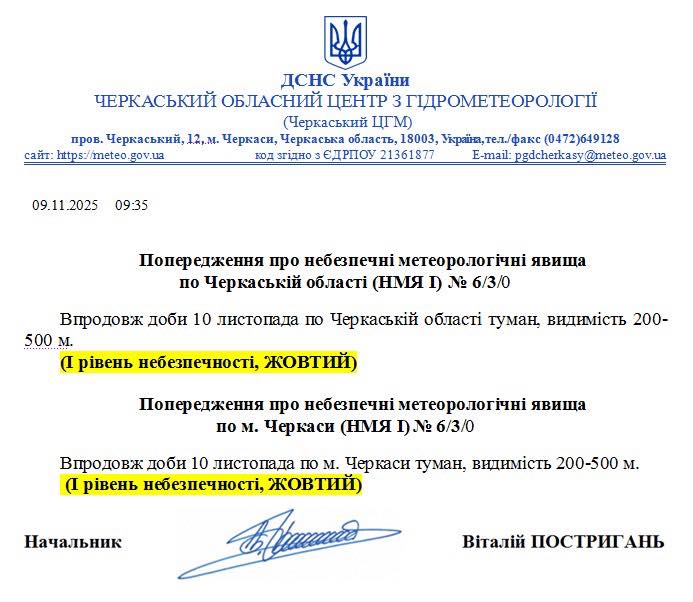 Увага! Оголошено попередження: вночі та вранці 10 листопада на Черкащині туман, видимість 200-500 м.
