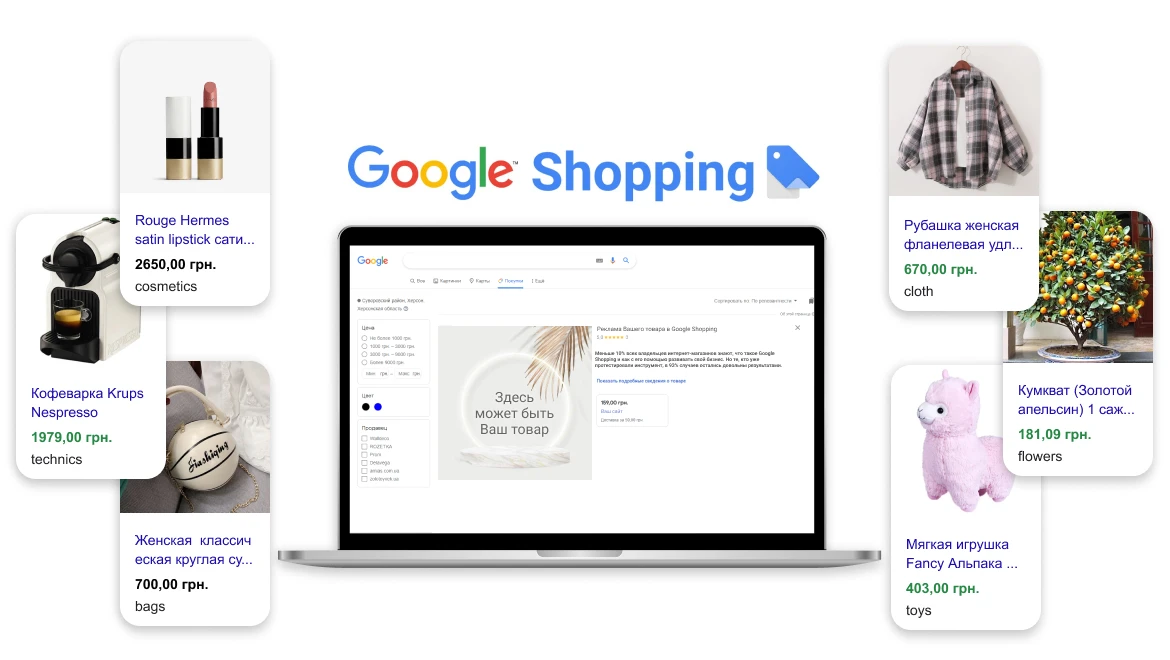 Товарні оголошення Google дозволяють клієнтам побачити потрібну річ вже на етапі пошуку. Крім фотографії виробу, реклама буде містити інформацію про сам товар, вартість, адресу магазину тощо.