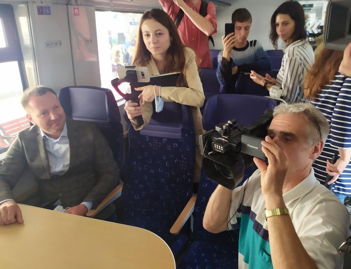 Усі троє увійшли в потяг – спочатку оглянули кабіну машиніста, потім пройшли у вагон і, прямо там, сидячи у зручних кріслах відповідали на запитання журналістів.
