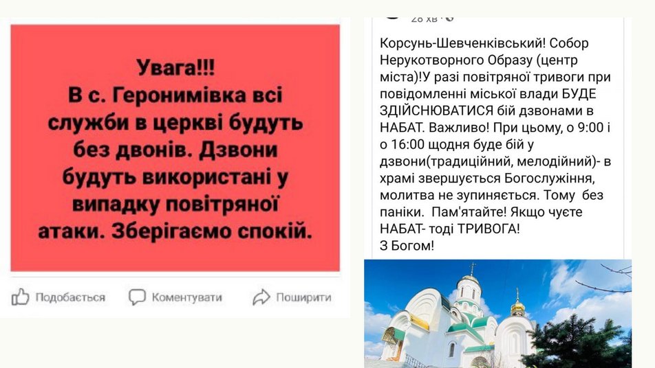 Так у Церкві Успіння Богородиці в селі Геронимівка на Черкащині заявили, що всі служби в церкві будуть без дзвонів. Дзвони будуть використані у випадку повітряної атаки.