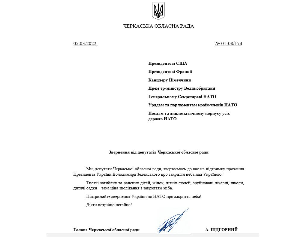 Кожен голос має значення! Депутати Черкаської обласної ради просять негайно закрити небо над Україною.