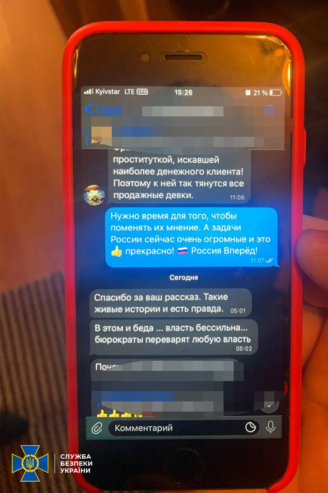 Крім того, в телеграм-каналах вела переписки з росіянами, де розповсюджувала фейки щодо діючої влади та ситуації в країні. У результаті обшуків у пропагандистки було вилучено: комп’ютерну техніку; мобільний телефон з доказами протиправної діяльності.