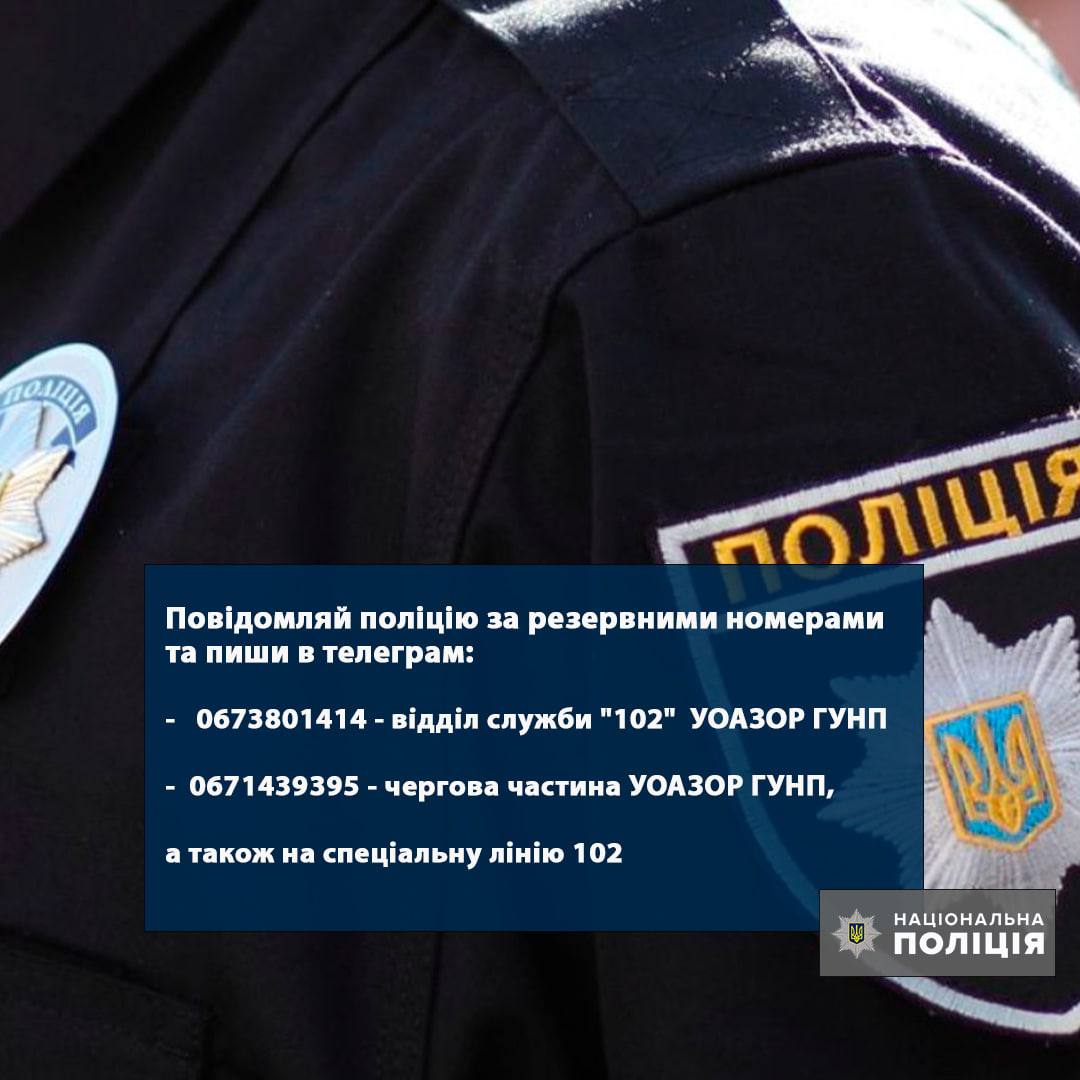 Відтак створено резервні номери телефонів. Збережіть собі ці контакти. За цими номерами телефонів ви можете звернутися та повідомити про подію, а також писати повідомлення в телеграм та надсилати фото: