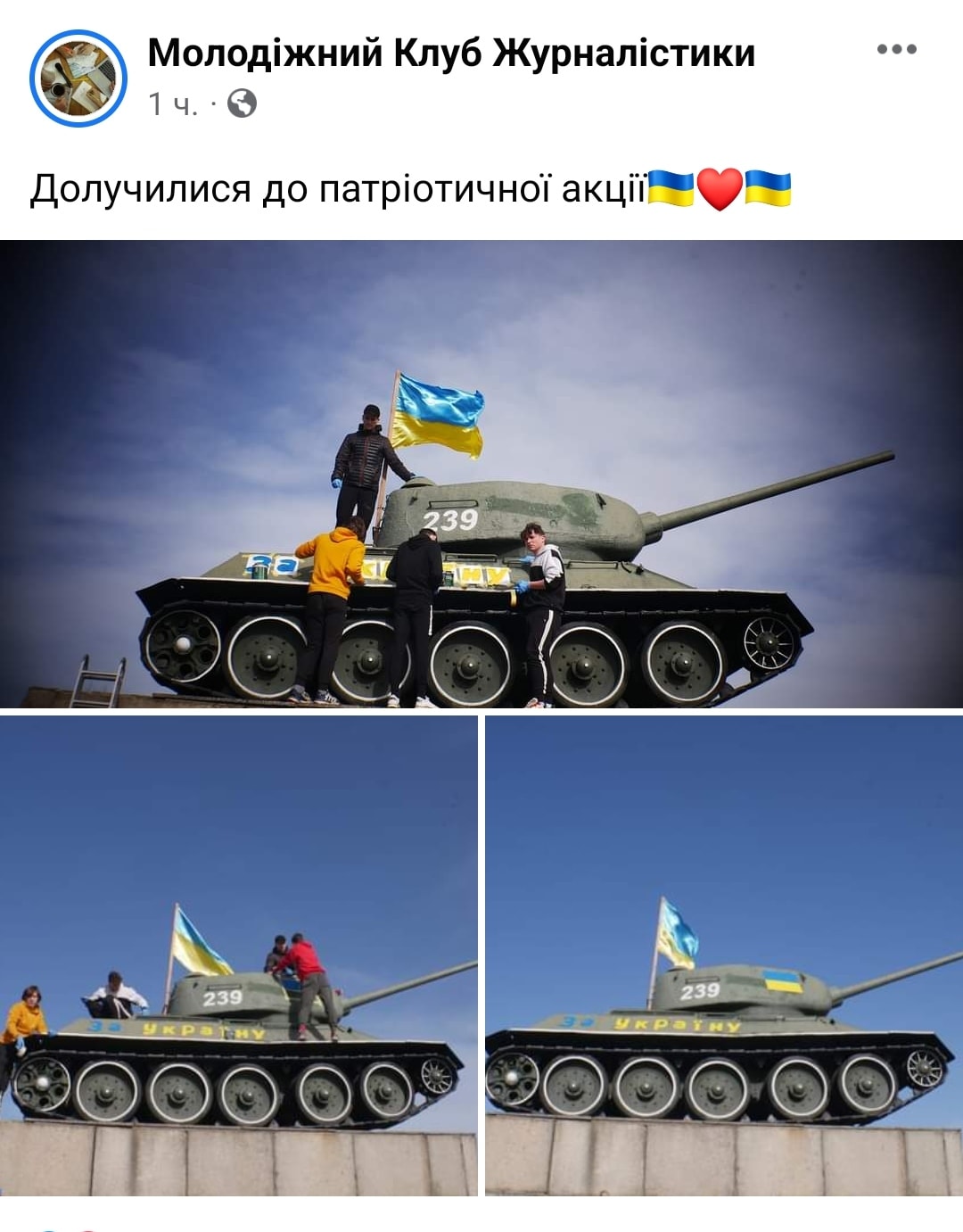 Золотоніська молодь "націоналізувала" танк Т-34, який розміщений в центрі міста Золотоноша. Тепер він прикрашений патріотичними написами і зі встановленим Державним стягом.
