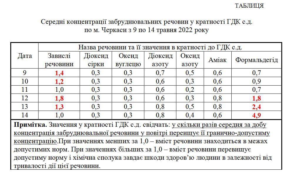 За період спостережень з 9 по 14 травня 2022 року було досліджено 395 проб атмосферного повітря. В цей період виявлені шкідливі речовини, концентрації яких у повітрі перевищують їх гранично допустиму концентрацію за середньодобовим вмістом (ГДК с.д.).