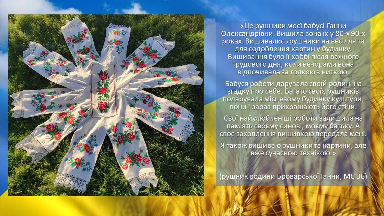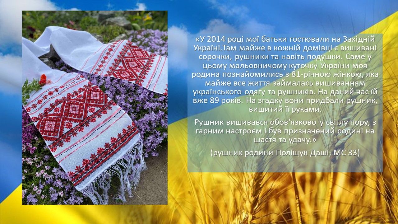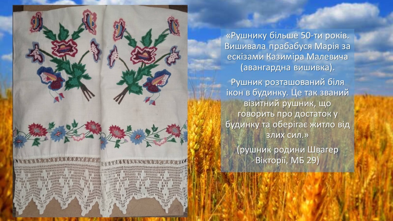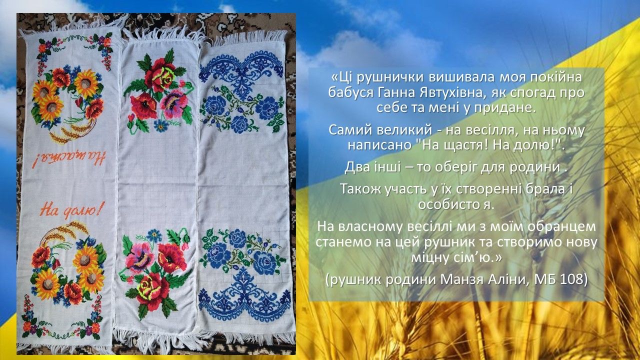 Любов до Вітчизни починається з любові до своєї Малої Батьківщини - місця, де людина народилась. Студентами Черкаського художньо-технічного коледжу було досліджено історії старовинних рушників, які зберігаються у їхніх родинах.