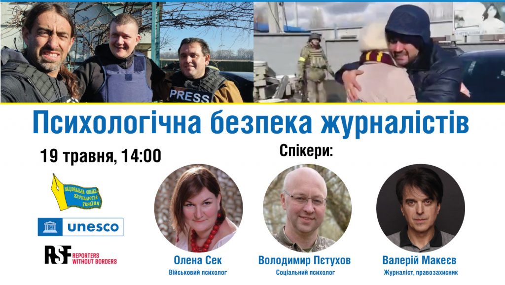 Ці та інші питання були в центрі уваги онлайн-тренінгу «Психологічна безпека журналістів, які висвітлюють війну в Україні», який відбувся у четвер, 19 травня. Це другий тренінг із циклу навчальних безпекових заходів, які реалізує Національна спілка журналістів України за підтримки ЮНЕСКО і у партнерстві із організацією «Репортери без кордонів».