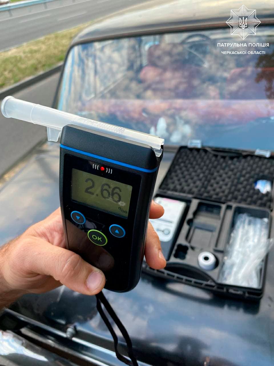 Уже за кілька хвилин інспектори виявили та зупинили вищевказаний транспортний засіб. Спілкуючись із керманичем, поліцейські виявили в останнього ознаки алкогольного сп’яніння та запропонували йому пройти огляд на стан сп’яніння, на що водій погодився. Результат — 2,66 проміле, що перевищує допустиму норму в 13 разів.