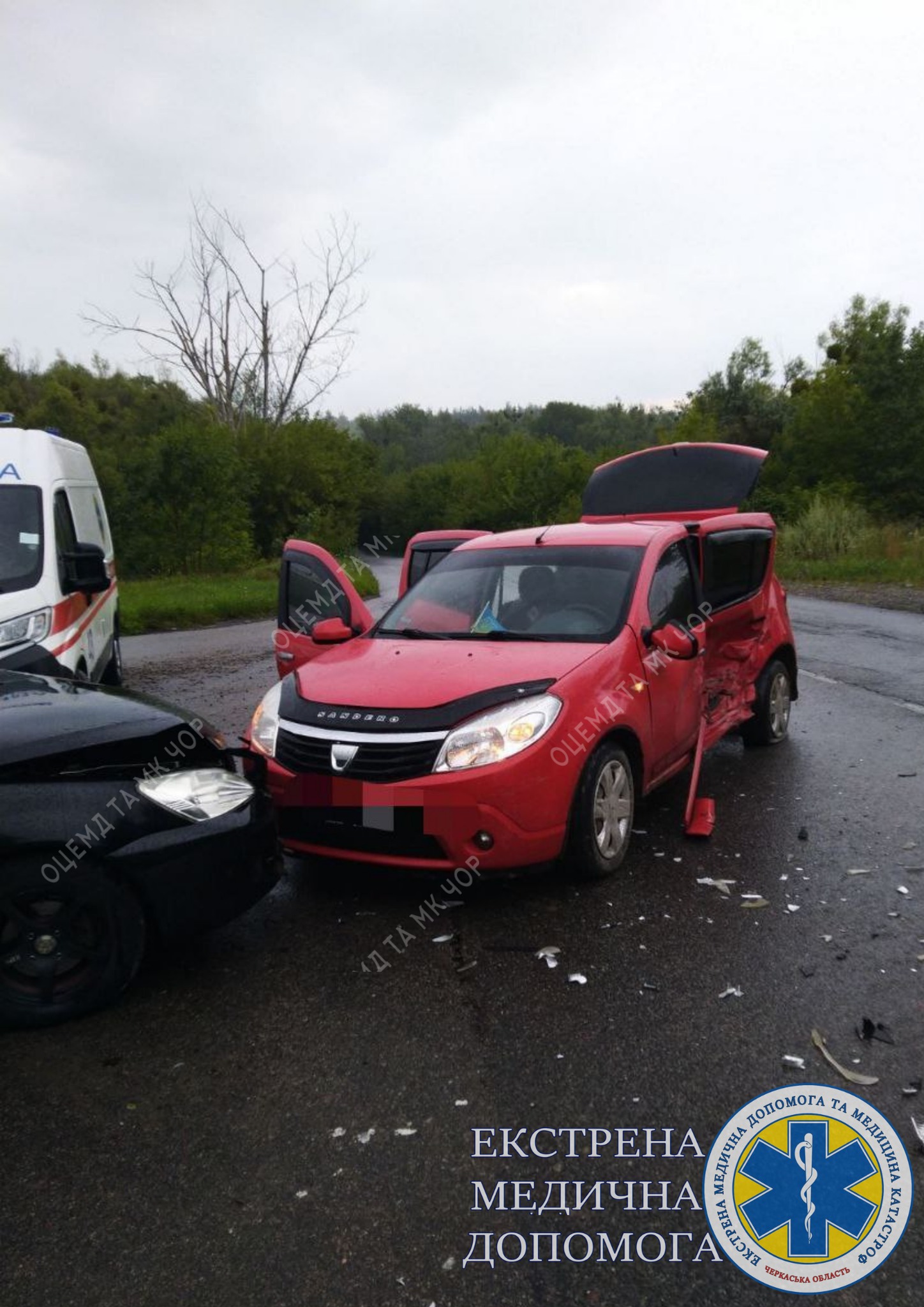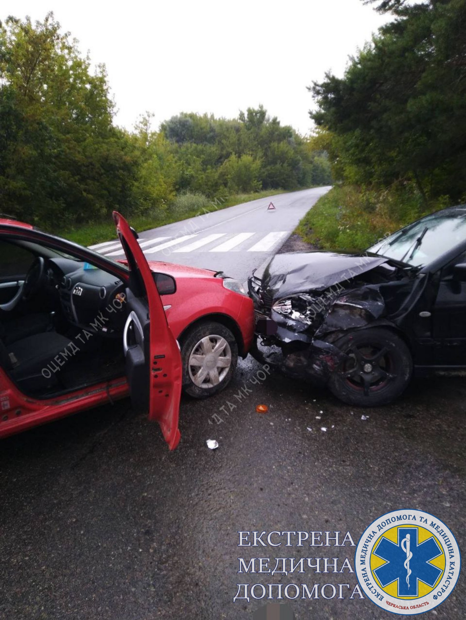 Бригада швидкої прибула до місця події та оглянула пасажирку одного з автомобілів. У 60-річної пацієнтки попередньо виявили садна, рвану рану та закриту черепно-мозкову травму. Її доправили до Канівської ЦРЛ.