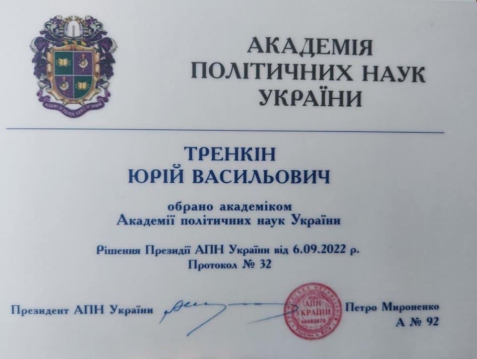 «Отримав Диплом академіка Академії політичних наук України. Вручив диплом академік-секретар Черкаського відділення АПН України, ректор Черкаського державного технологічного університету Олег Григор. Маю чималий практичний політичний досвід, відтак підсилю команду Академії», – зазначає у дописі Юрій Тренкін.