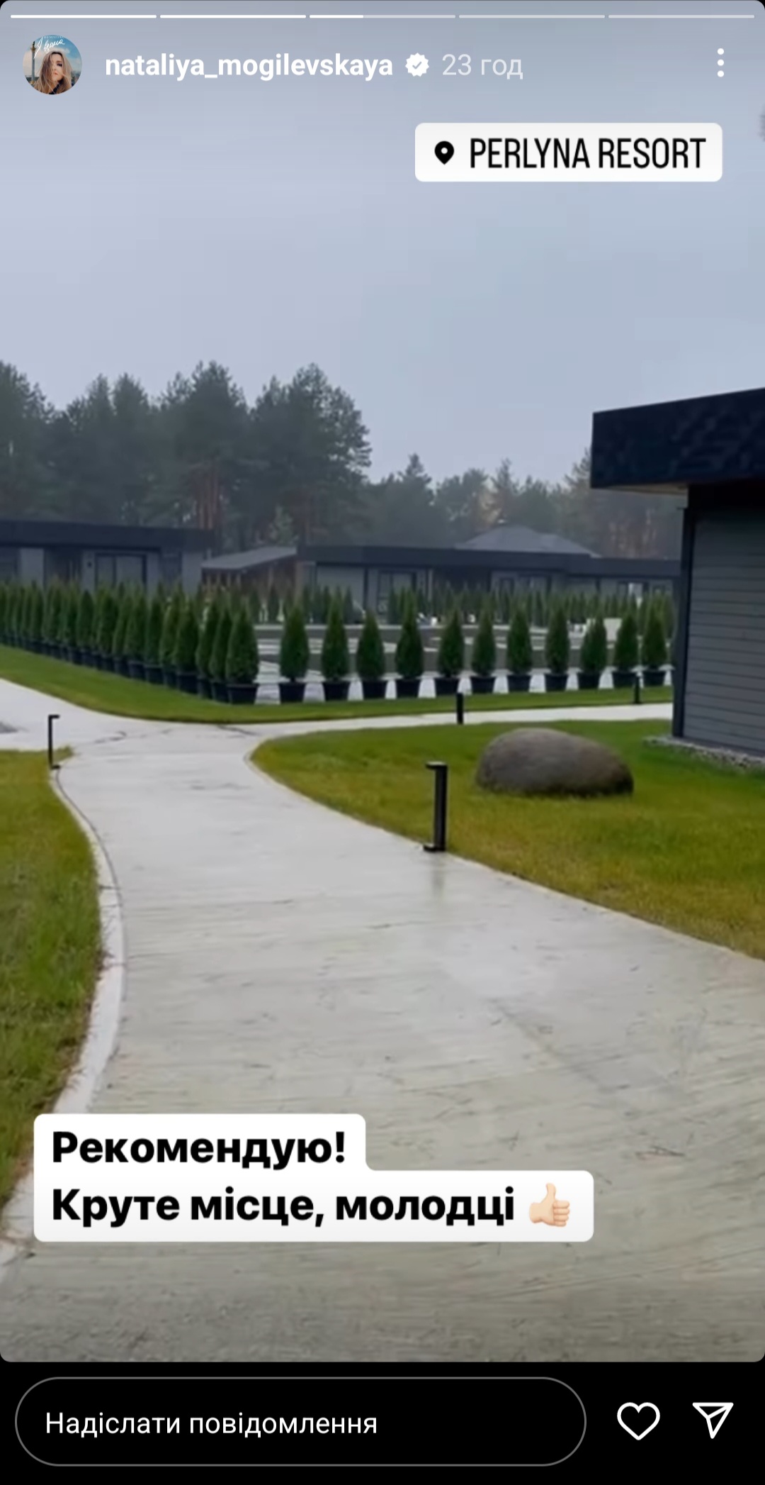 Із соціальних мереж артистки було видно, що 23 жовтня вона перебувала недалеко від Мошногірського масиву в сучасному ресторанно-готельному комплексі «Перлина Резорт». Зірка була приємно здивована ландшафтним дизайном ресторанно-готельного комплексу.