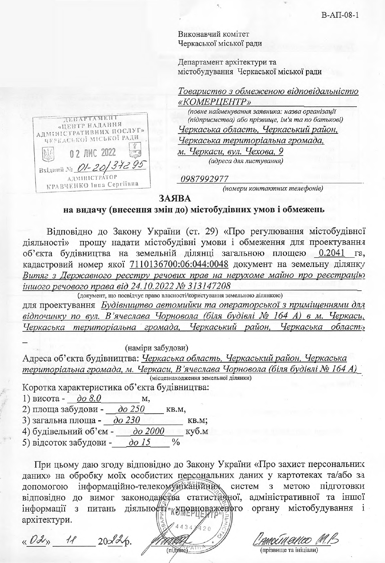 Відповідно до заявки на отримання дозволу там мають намір збудувати автомийку вистою до 8 метрів і площею до 250 м. кв. Також планується будівництво приміщення для операторів, де вони відпочиватимуть. Поки що департамент архітектури та містобудування Черкаської міської ради дозвіл не надав.