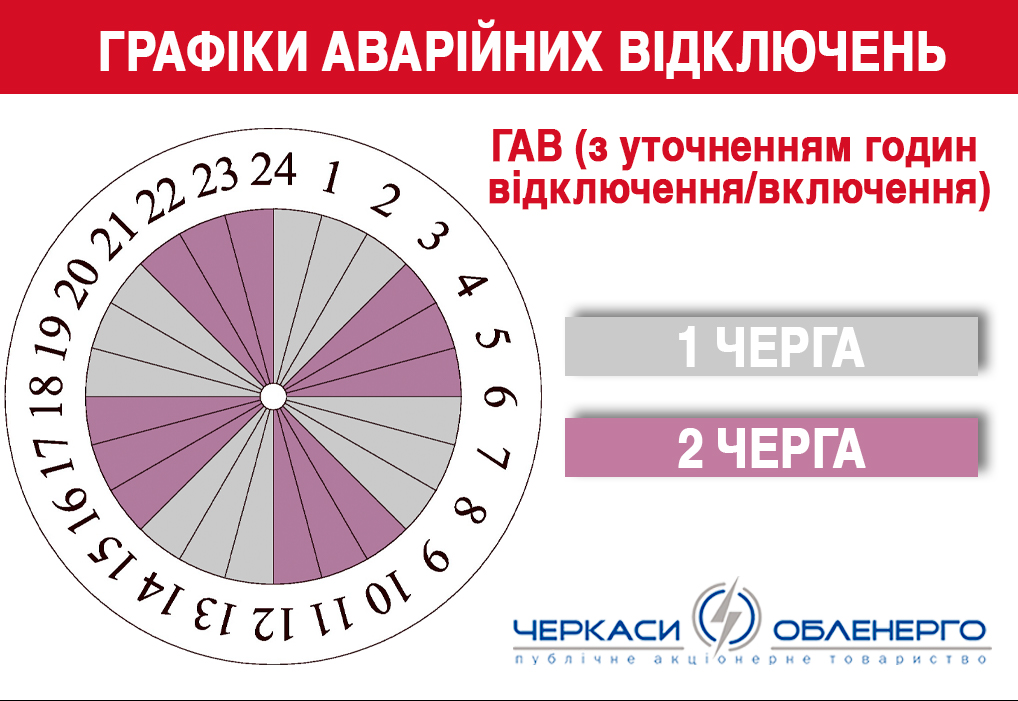 Через критичну ситуацію в об’єднаній енергосистемі країни та велику кількість пошкоджених енергооб’єктів по Черкаській області з 18 листопада об 00:00 годин розпочнуть застосовувати ГАВ (графіки аварійних відключень з уточненням годин відключення/включення).
