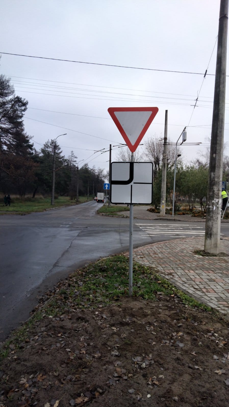 Дорожні знаки 2.1 "Дати дорогу" та 2.3 "Головна дорога" з табличками 7.8 "Напрямок головної дороги" встановлено по вулиці Олексія Панченка.