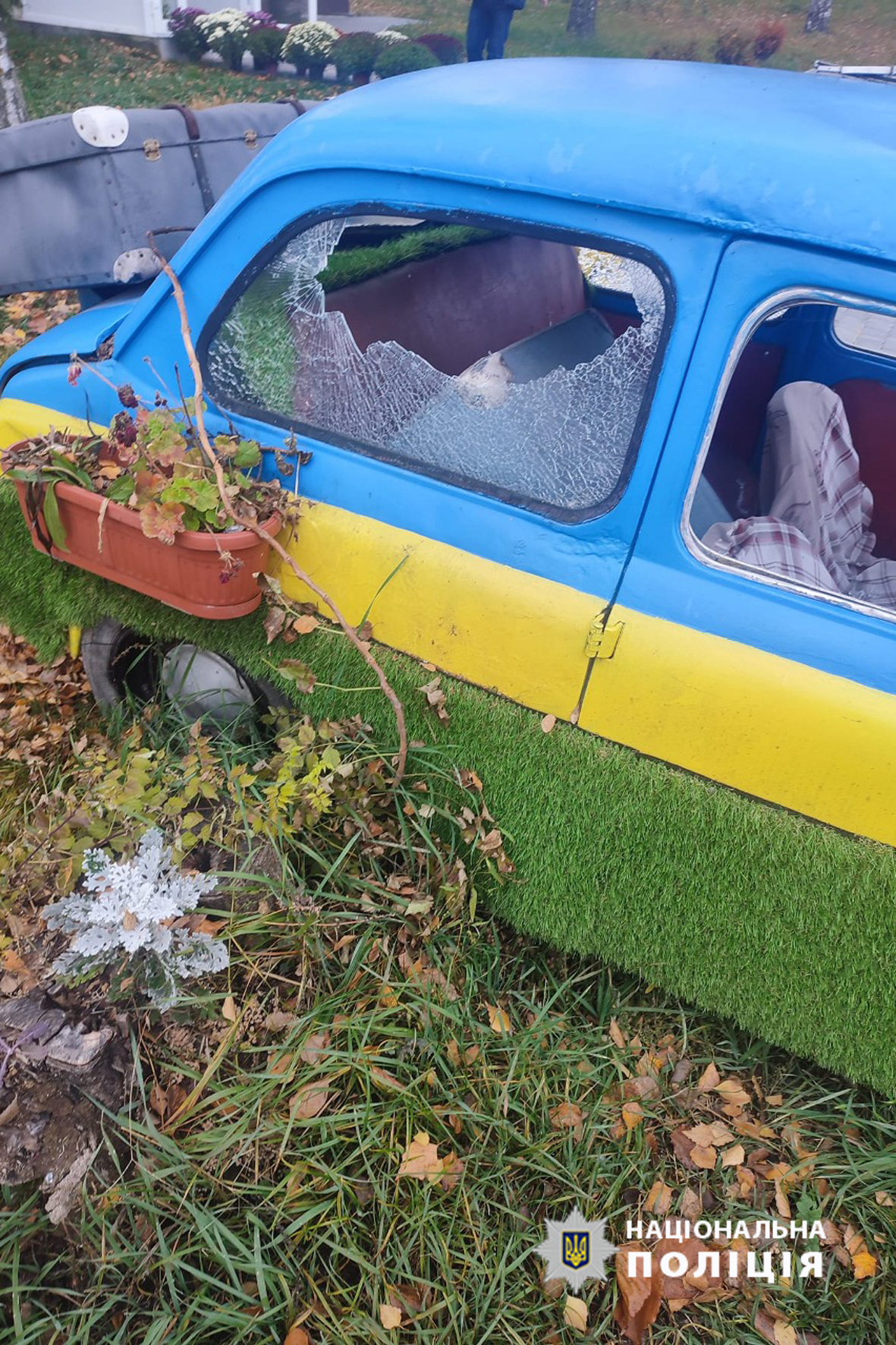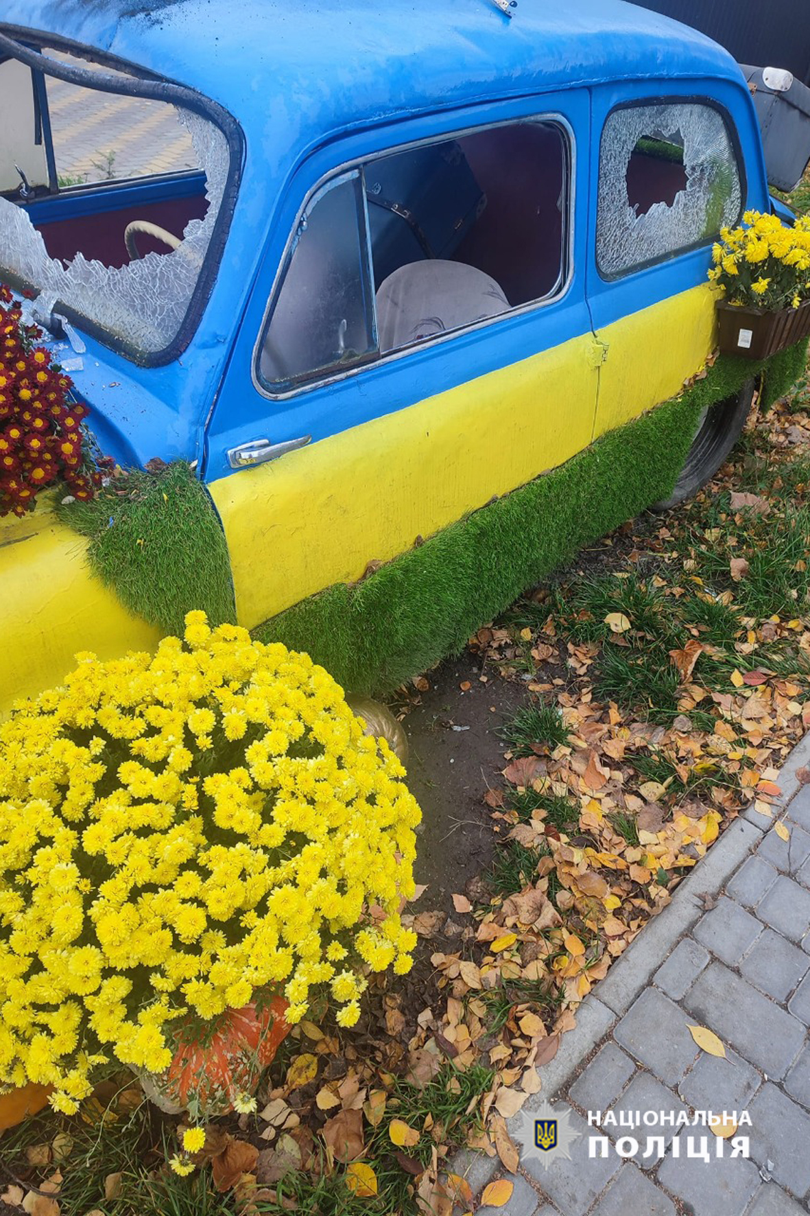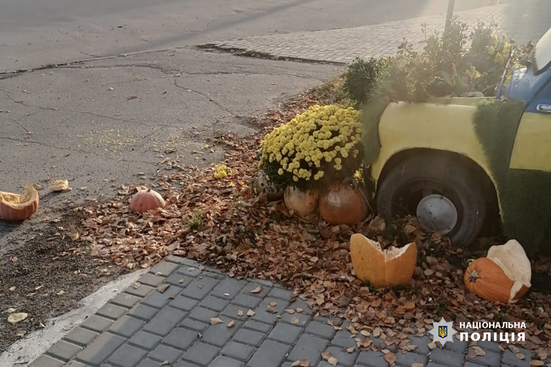 2 листопада в одній із соціальних мереж було розміщено пост в якому жителька Монастирища обурилася діями невідомих, що пошкодили автомобіль ЗАЗ декорований квітами у синьо-жовтих кольорах.