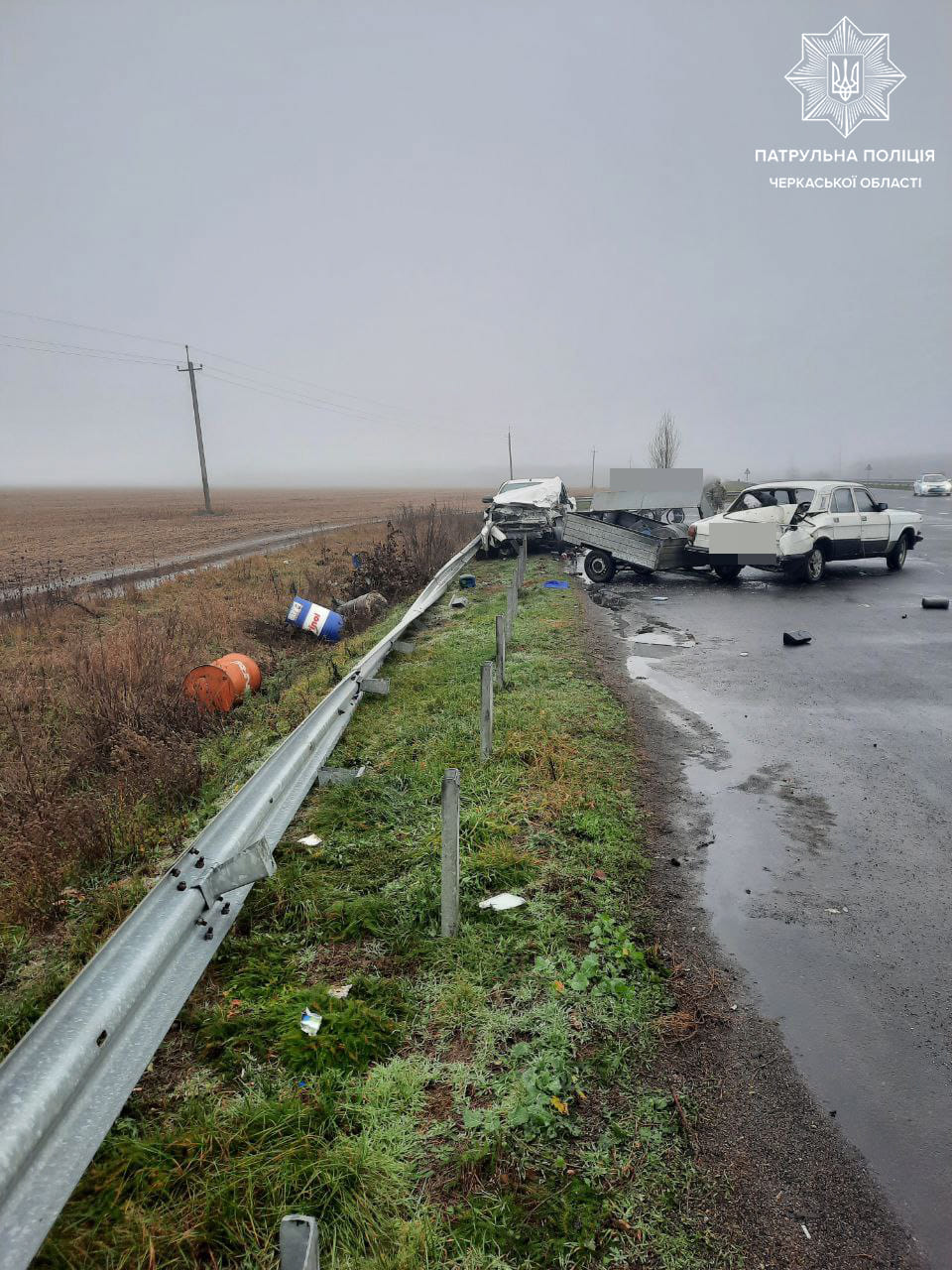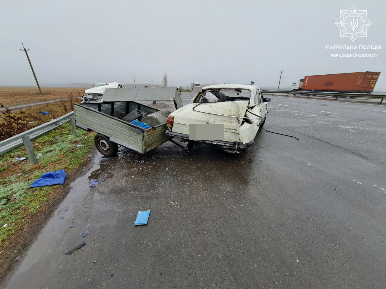 Від удару автівку Toyota відкинуло у дорожнє огородження та припаркований автомобіль ГАЗ 2410 з напівпричепом, пошкодивши автівку та огородження.