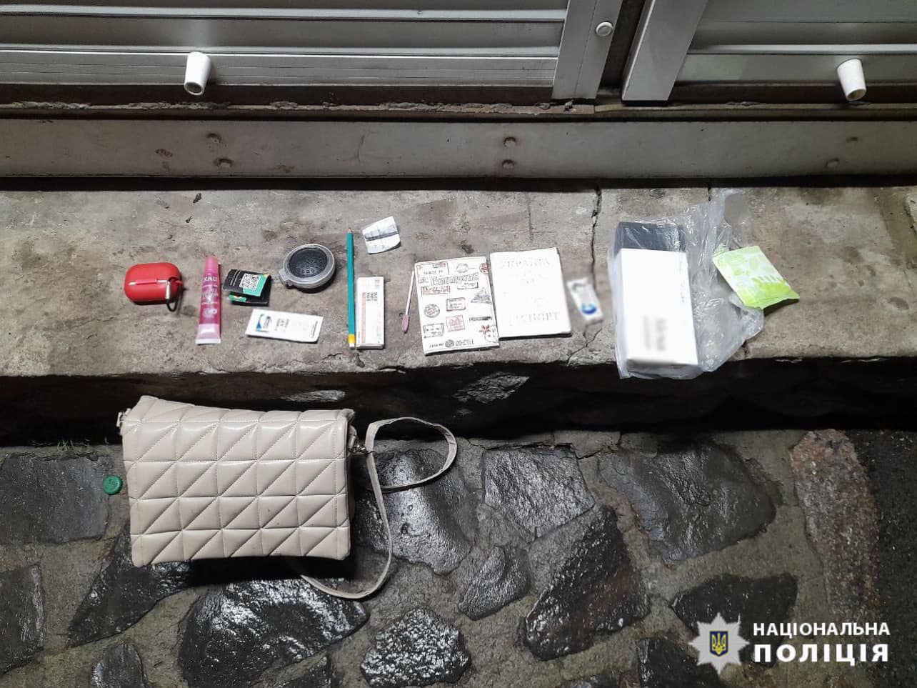Під час обстеження місця події, піший наряд правоохоронців виявив неподалік викинуту сумку потерпілої. Тим часом оперативники кримінального розшуку встановили особу правопорушника.