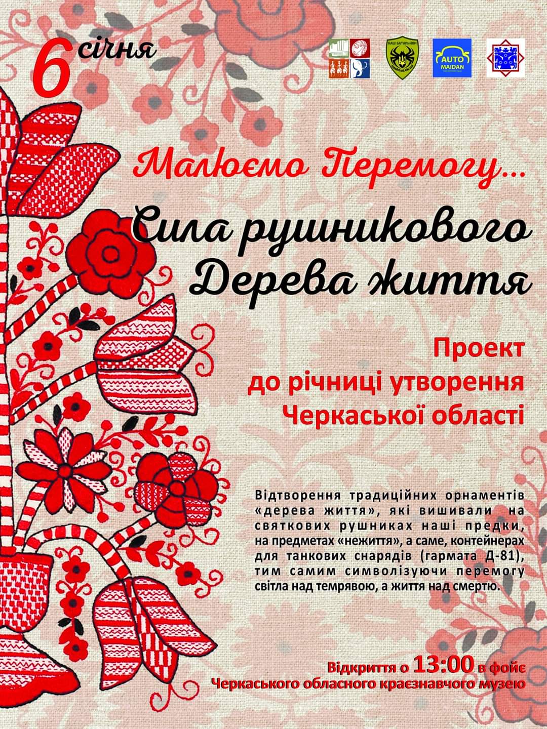 Він має назву «Малюємо Перемогу… Сила рушникового Дерева життя» і приурочений до річниці утворення Черкаської області. Проєкт реалізують Черкаський обласний краєзнавчий музей у співпраці з ГО «Наш батальйон» та ГО «Автомайдан. Черкаси», майстрами Черкаського обласного осередку Національної спілки майстрів народного мистецтва України, художниками та студентами профільних навчальних закладів.