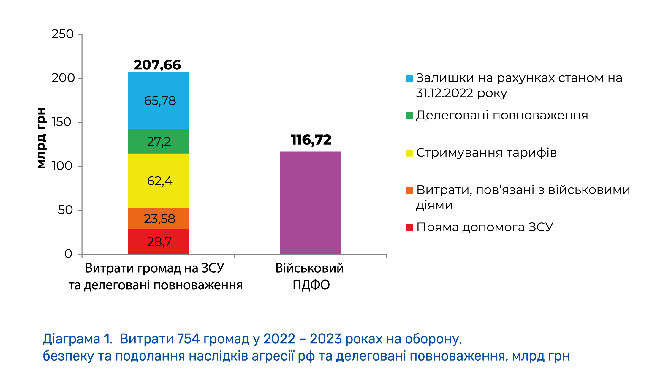 Військовий ПДФО цих громад за фактом 2022 року і планом 2023-го сумарно становитиме 116,72 млрд грн (за даними офіційного державного порталу Open budget по всіх громадах, сумарний обсяг військового ПДФО за 2022–2023 роки становитиме 128 млрд грн).