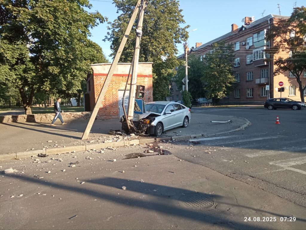 Сьогодні зранку, 24 серпня, у Черкасах на перехресті вулиць Надпільної та Небесної Сотні легковик врізався в електроопору. Через аварію рух вулицею Небесної Сотні тимчасово перекрили.