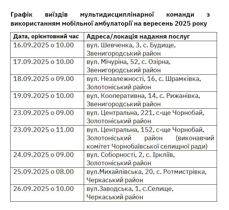 У вересні 2025 року в Черкаській області продовжує роботу мобільна амбулаторія для надання послуг профілактики та скринінгу соціально значущих хвороб: