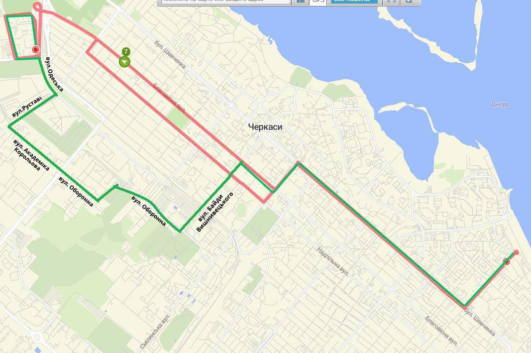 У прямому напрямку: Юрія Іллєнка – бульвар Шевченка – Смілянська – Благовісна – Байди Вишневецького – Оборонна – Академіка Корольова – Руставі – Одеська – Онопрієнка – Смаглія – Олексія Панченка – Генерала Момота.