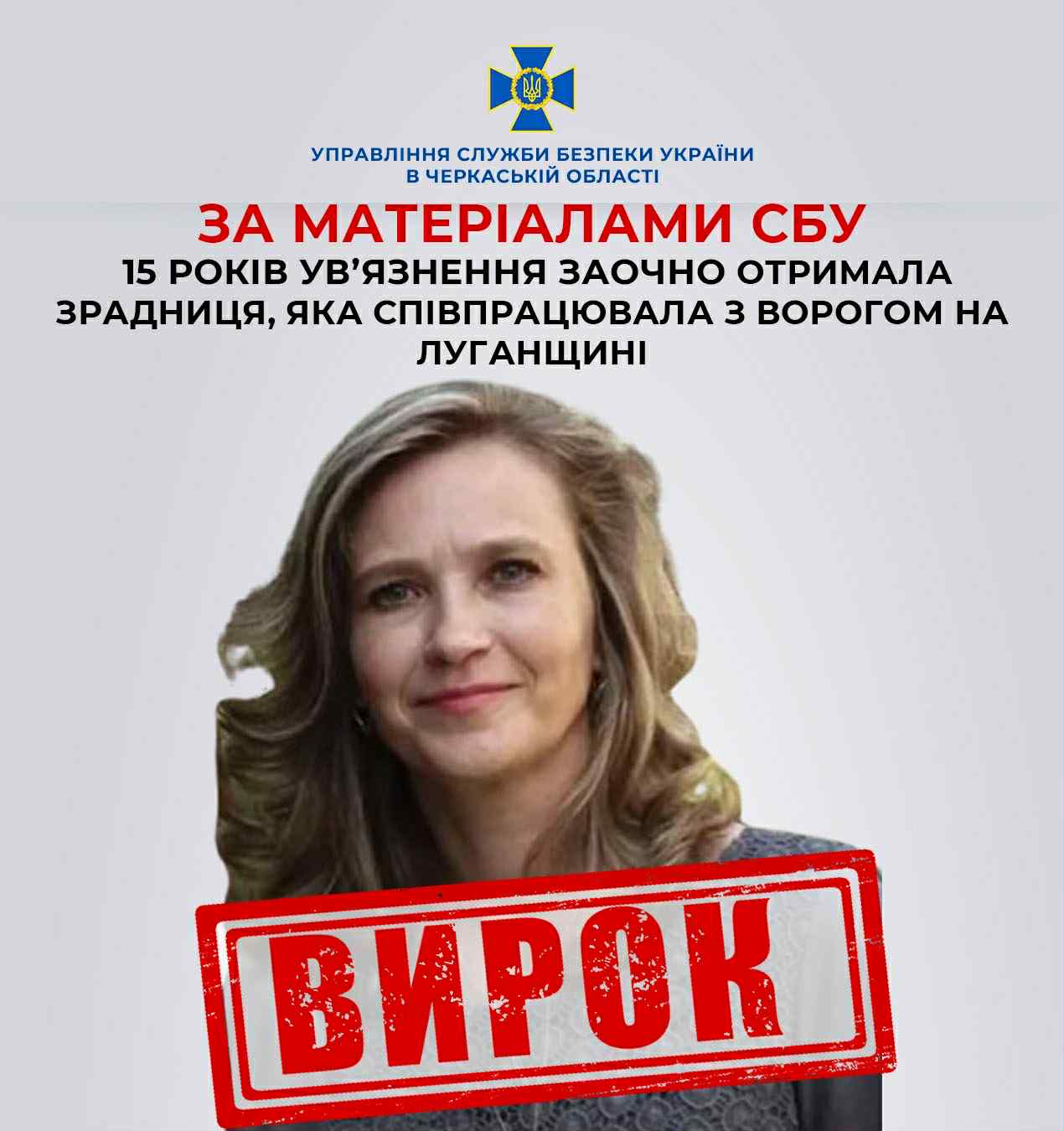 Зрадниця отримала заочно 15 років тюрми з конфіскацією майна. Крім того, засуджену позбавлено права обіймати посади в органах державної влади та місцевого самоврядування на строк 15 років. Розслідування проводили слідчі СБУ в Черкаській області за процесуального керівництва обласної прокуратури.