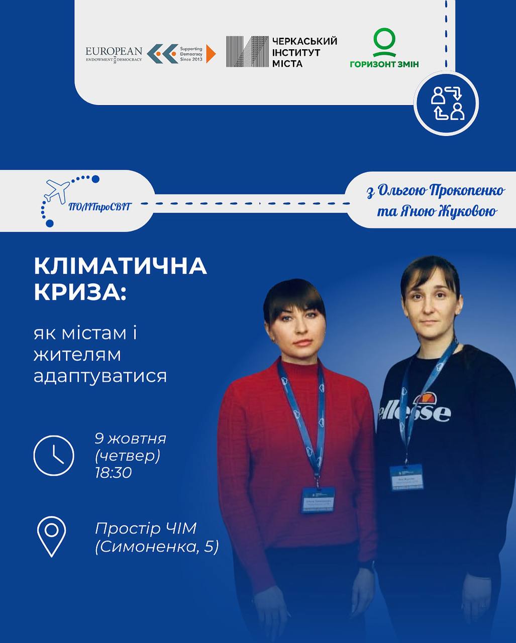 Зустріч-лекція «Кліматична криза: як містам і жителям адаптуватися» відбудеться у Черкасах 9 жовтня о 18:30 годині у просторі Черкаського інституту міста на Симоненка, 5.