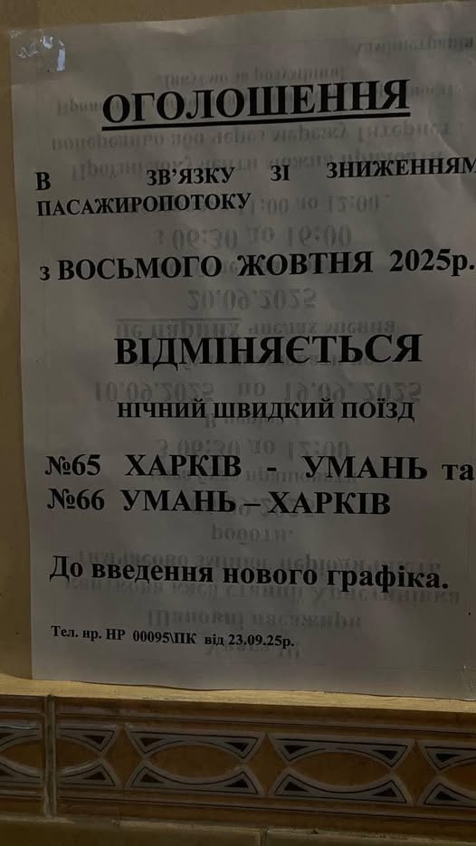 З 8 жовтня Умань залишається без поїзда 65/66 Харків - Умань, у Черкас забирають поїзд 165 Харків - Черкаси.