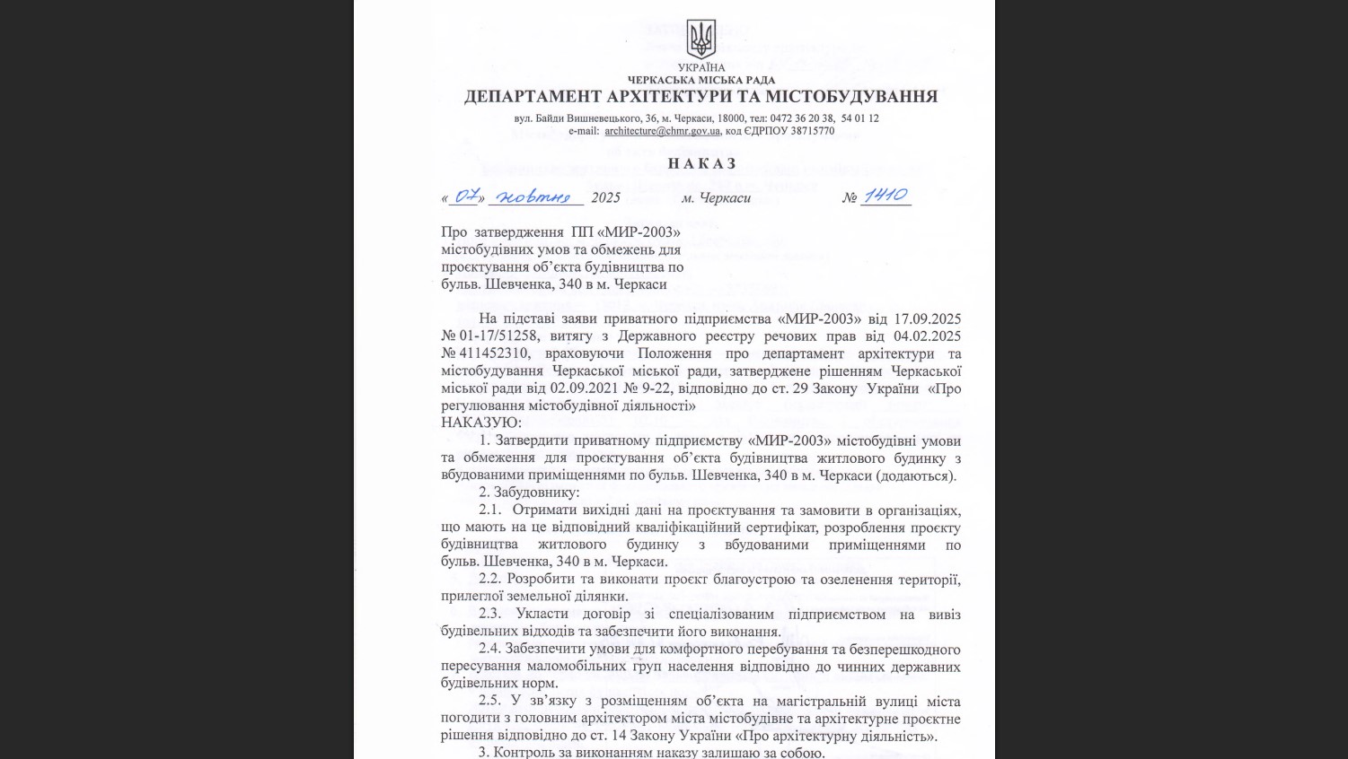 Забудовник ПП «Мир-2003» отримав містобудівні умови та обмеження на зведення багатоповерхівки із вбудовано-прибудованими приміщеннями.