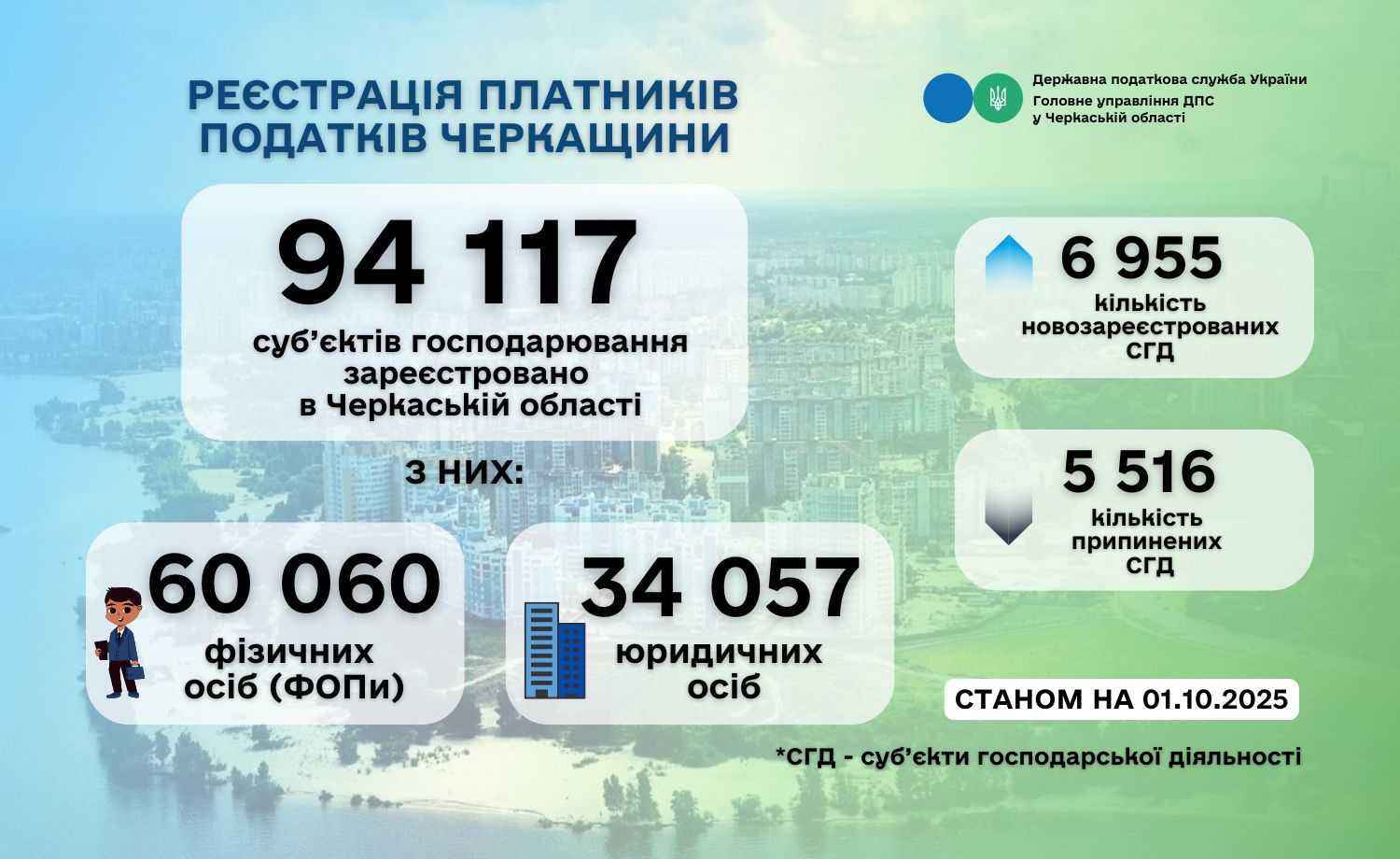 Станом на 01.10.2025 на Черкащині зареєстровано 94 117 суб’єктів господарювання, із них: 60 060 фізичних осіб-підприємців та 34 057 юридичних осіб.