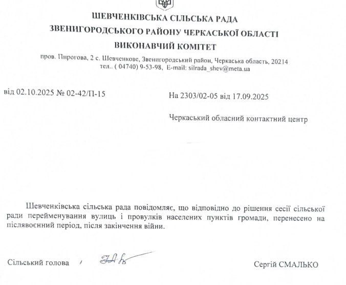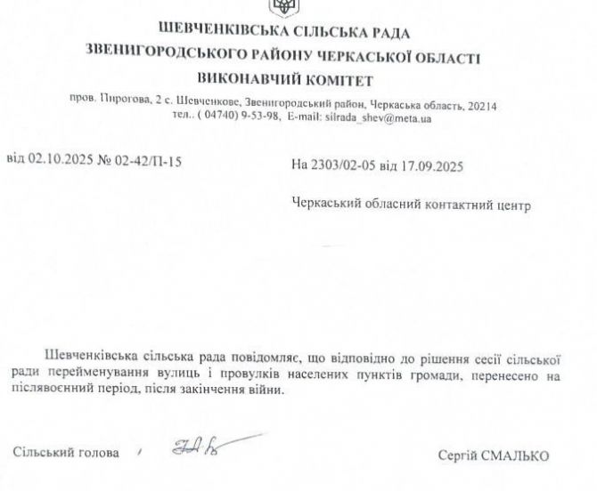 «Шевченківська сільська рада повідомляє, що відповідно до рішення сесії сільської ради перейменування вулиць і провулків перенесено на післявоєнний період", – ідеться в повідомленні сільської ради.