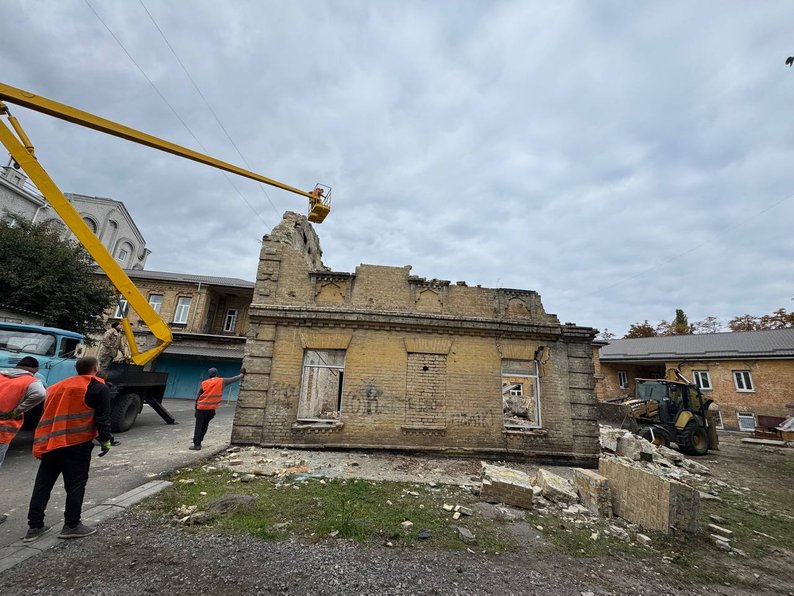 У Черкасах розпочали демонтаж аварійного корпусу музичної школи №1, де раніше були навчальні класи. Нині тут зносять стіни та зберігають фасадну цеглу.