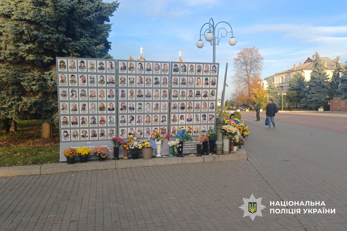 30 жовтня до Черкаського районного управління поліції звернулась місцева мешканка з повідомленням про те, що на площі Слави у місті Черкаси невідомий осквернив місце з портретами воїнів Збройних сил України.