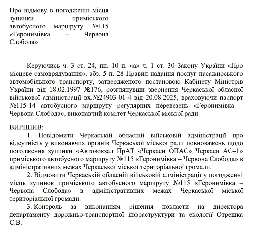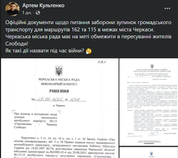 Член виконавчого комітету Слобідської громади Артем Культенко опублікував у фейсбуці допис. До нього були додані світлини рішення Черкаської міської ради щодо відмови Черкаській ОВА у погодженні місць зупинок приміського автобусного маршруту №115 «Геронимівка–Червона Слобода» в межах Черкас.
