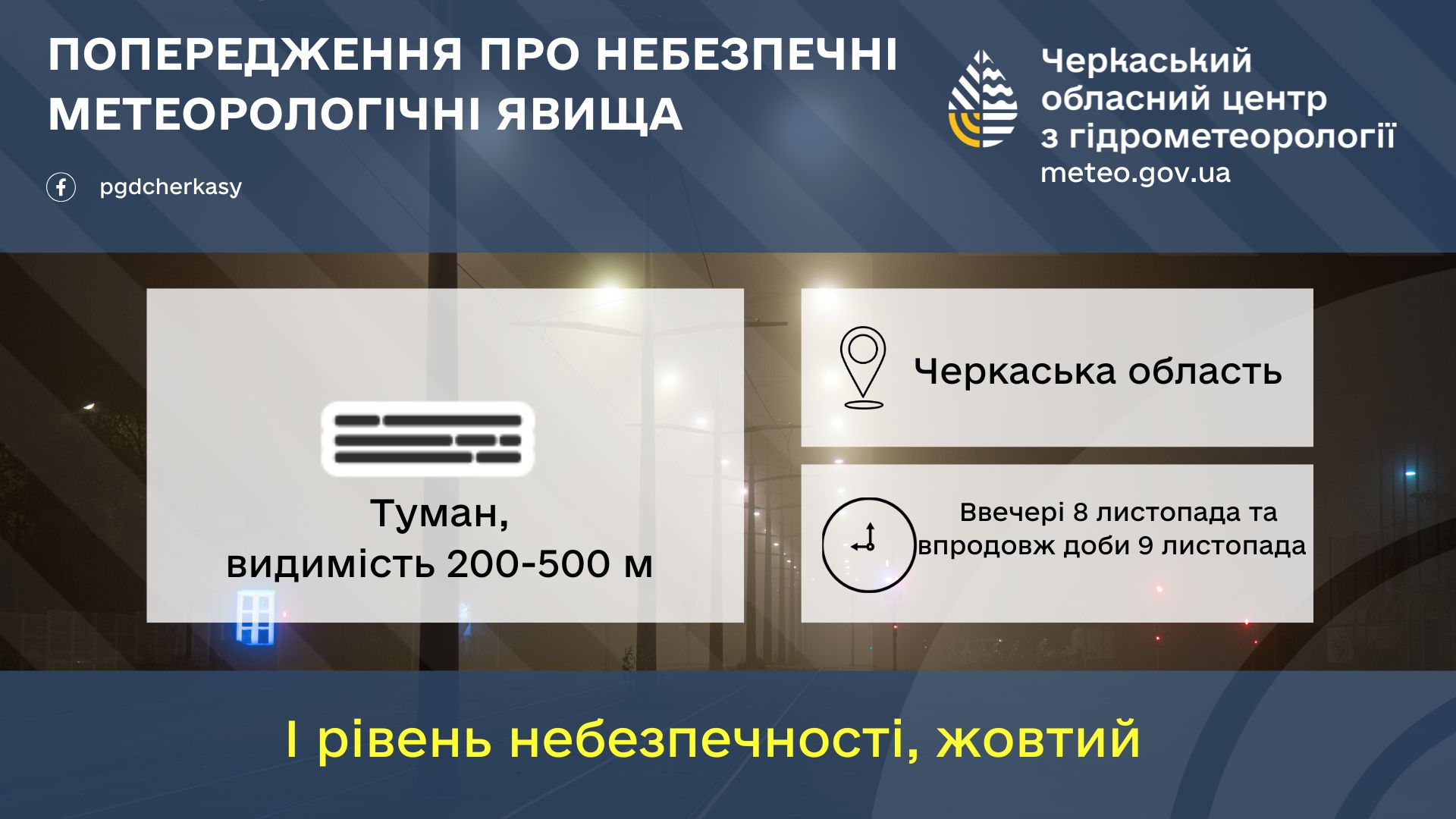 Ввечері 8 листопада та впродовж доби 9 листопада по Черкаській області та м. Черкаси туман, видимість 200-500 м