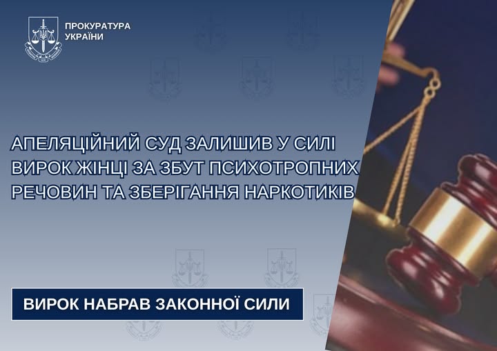 Черкаський апеляційний суд залишив без змін вирок Соснівського районного суду міста Черкаси щодо 45-річної мешканки міста, визнаної винною у збуті психотропної речовини та зберіганні наркотиків.