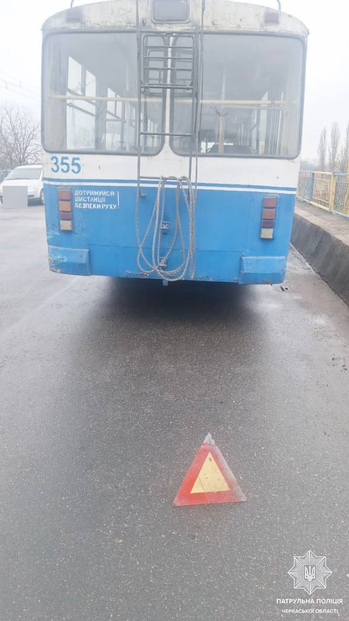 Як повідомляє пресслужба патрульної поліції Черкаської області, водій автомобіля Kia Sportage не дотримався безпечної швидкості і безпечної дистанції, зіштовхнувся з тролейбусом.