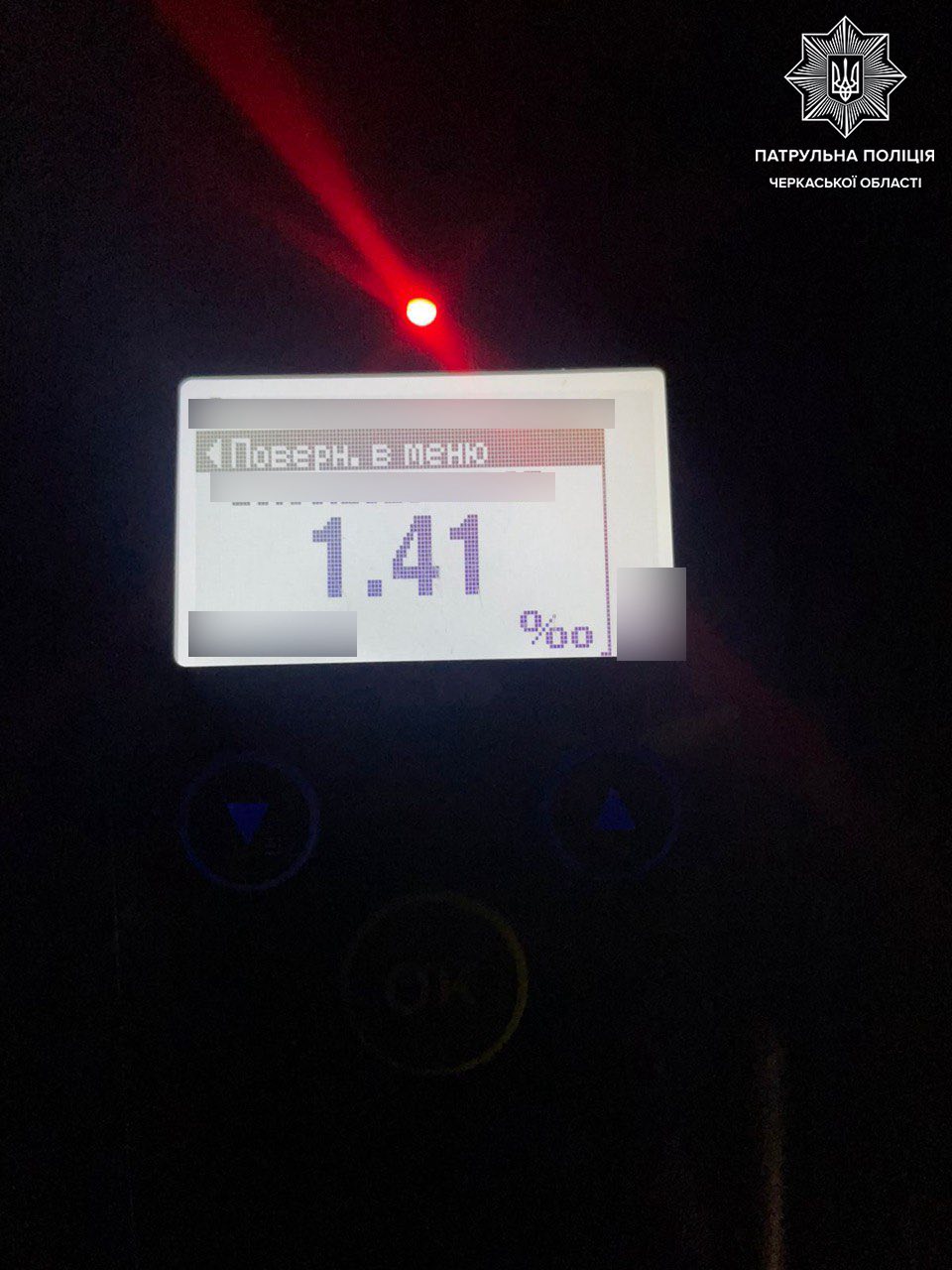 Спілкуючись із керманичем авто ВАЗ, поліцейські виявили в останнього ознаки алкогольного сп’яніння та запропонували йому пройти огляд на стан сп’яніння на місці, за допомогою приладу Драгер. Результат — 1,41 проміле.