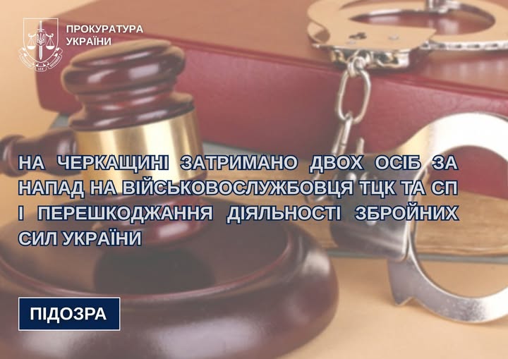 За процесуального керівництва прокурорів Черкаської обласної прокуратури на території Черкаського району Черкаської області повідомлено про підозру двом уродженцям м. Черкаси за фактами умисного заподіяння легкого тілесного ушкодження службовій особі у зв’язку з її службовою діяльністю та перешкоджання законній діяльності Збройних Сил України в особливий період, вчинених за попередньою змовою групою осіб (ч. 2 ст. 28, ч. 1 ст. 114-1, ч. 2 ст. 350 КК України).
