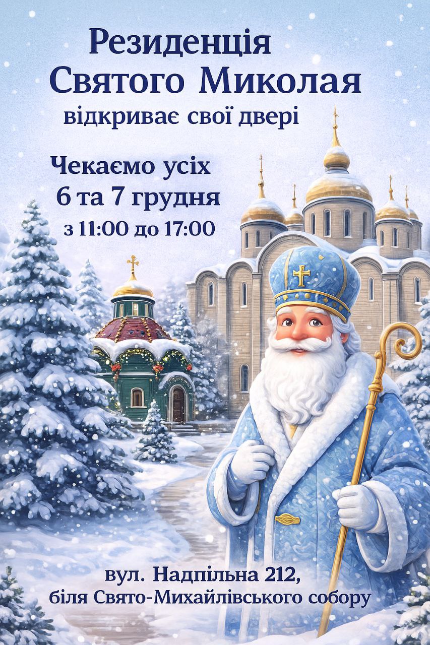 5, 6 та 7 грудня біля Святомихайлівського кафедрального гарнізонного собору (м. Черкаси, вул. Надпільна, 212) працюватиме Резиденція святого Миколая.