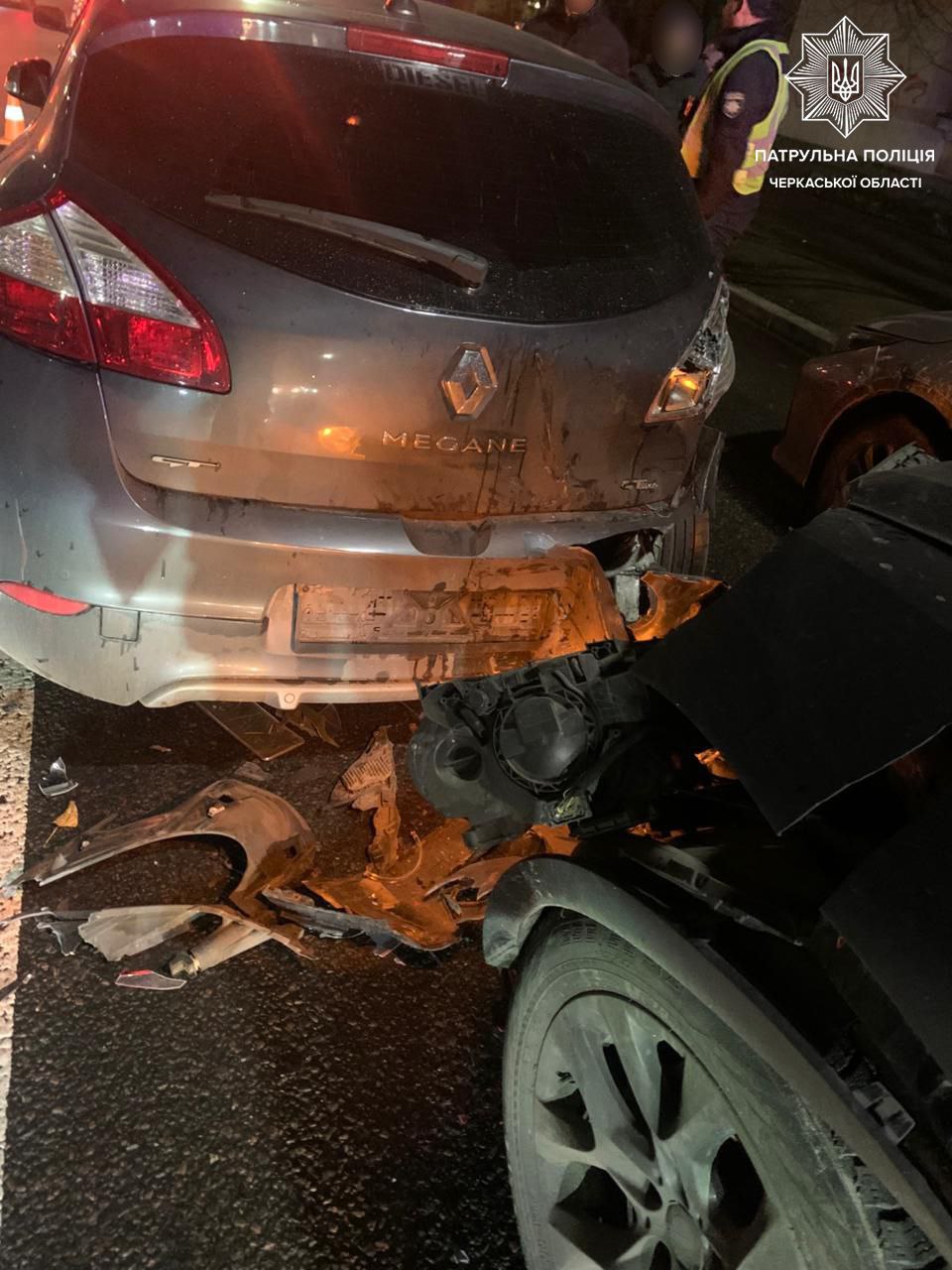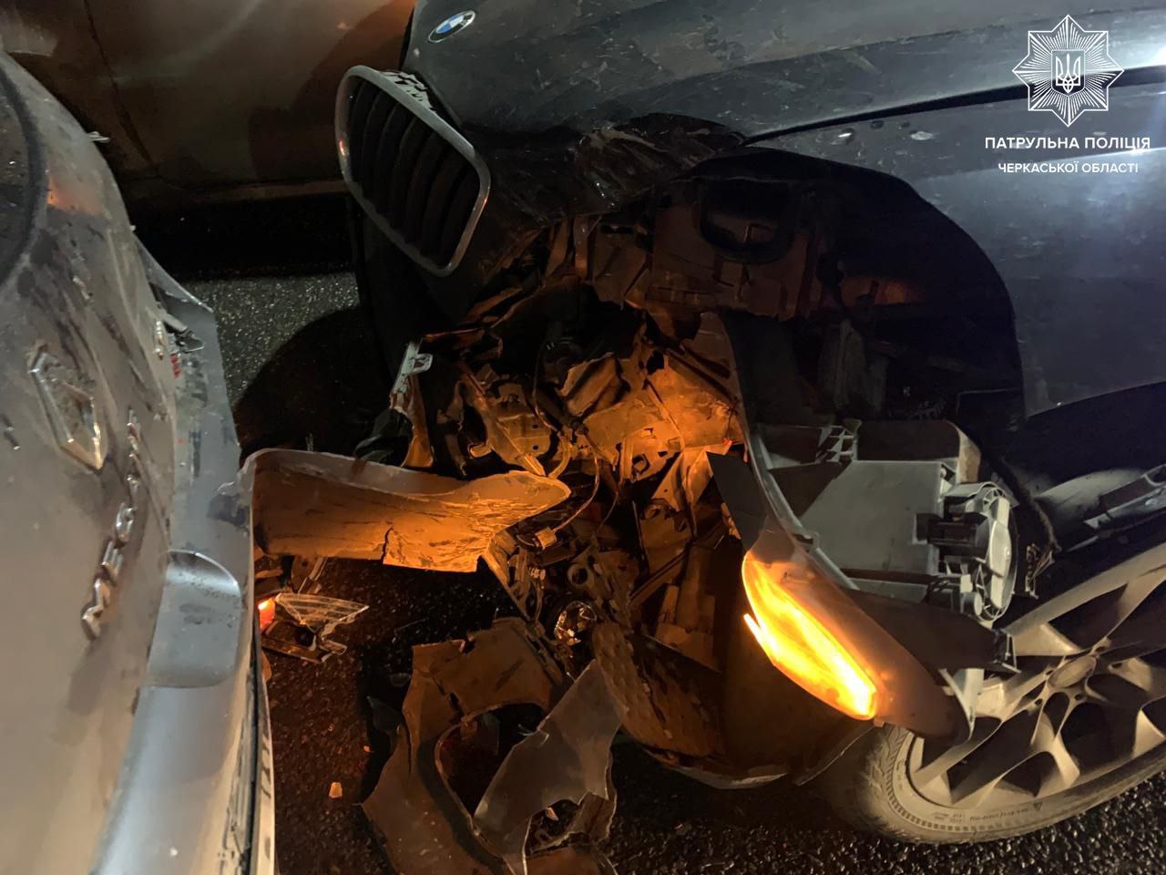 Як повідомляє патрульна поліція Черкаської області, керманичка транспортного засобу BMW X5 не дотрималася безпечної швидкості, безпечної дистанції та здійснила зіткнення з авто Renault Megane, що рухалося попереду.