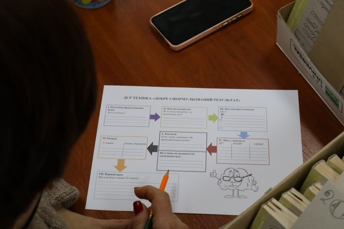 У практичній частині психологиня познайомила учасників із технікою «Добре сформульований результат», яка допомагає перетворити розпливчасте бажання на конкретну, досяжну ціль. Було розглянуто сім ключових критеріїв добре сформульованого результату: позитивне формулювання, підконтрольність, сенсорність, контекст, екологічність, необхідні ресурси та перший крок. Ця техніка допомагає структурувати бажання й значно підвищує шанси на його реалізацію.