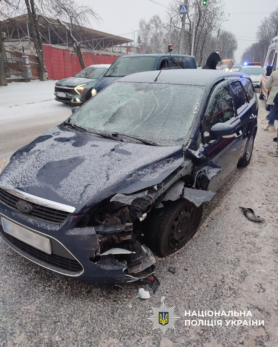 Попередньо встановлено, що 37-річний водій автомобіля Ford Focus, рухаючись у напрямку проспекту Перемоги, скоїв наїзд на жінку, яка переходила дорогу по нерегульованому пішохідному переходу, повідомляє поліція Черкащини. Після цього Ford виїхав на зустрічну смугу, де зіткнувся з автомобілем Jeep Renegade під керуванням 50-річної водійки.